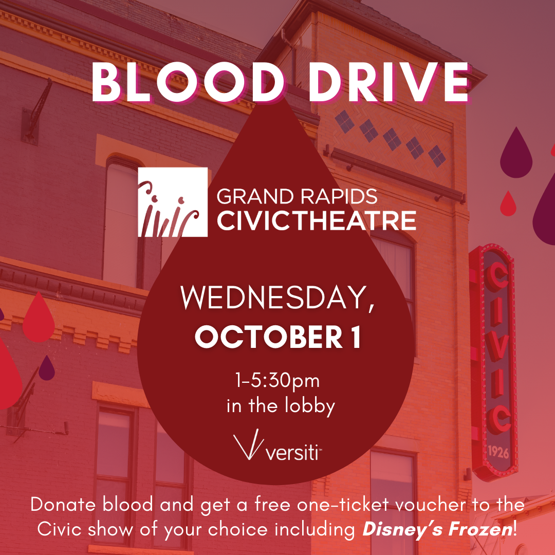Join us on Wednesday, October 1, 2025 for a Blood Drive in the Grand Rapids Civic Theatre Hungerford Lobby. You can schedule your appointment in advance by clicking the button below.